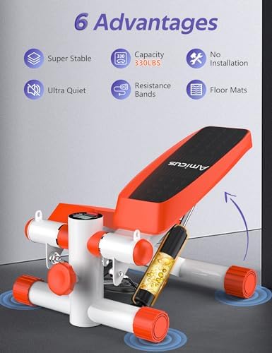 Amicus Mini Stepper for Exercise, Stair Stepper with Resistance Bands, Hydraulic Fitness Stepper Exerciser Machine for Home, 330lbs Weight Capacity, Orange White