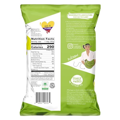 SUSTAINABLE, NON-HYDROGENATED PALM OIL: Artisan Tropic has received the highest level of RSPO Certification (Roundtable on Sustainable Palm Oil) as a manufacturer and brand. These paleo plantain chips are good for you and the planet!