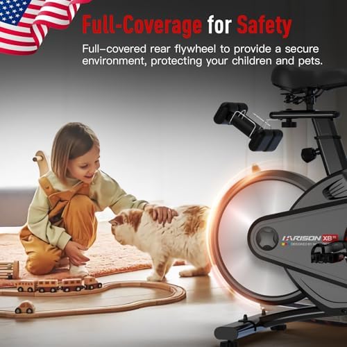 【Fully Covered Flywheel for Safety】 HARISON cardio bikes for home use features a 360° fully covered flywheel, minimizing the risk of accidental injuries from exposure during cycling. This fully covered design reduces the noise generated during riding, creating a more tranquil riding experience for your home gym. The cover prevents debris from entering the flywheel, extending the bike’s lifespan and reducing maintenance needs.