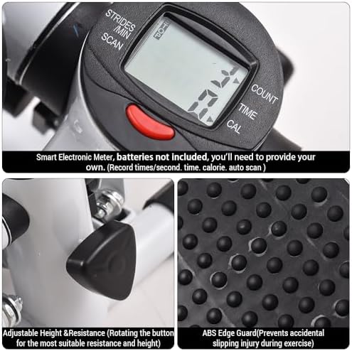 【High-quality & Durable】Made of heavy-duty steel structure, with high durability and stability, low noise. Applying LR44 button battery (Not included!) Size is 35×28.5x19cm/13.8×11.2×7.5in. The max load-bearing capacity of the mini stepper is 220 pounds!