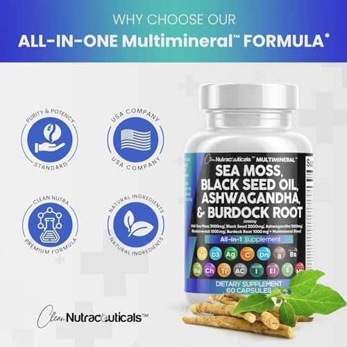 The Raw Sea Moss and Black Seed Oil Capsules You’ve Been Looking For – Clean Nutra’s MultiMineral provides 6 full-dose products in one, containing a full Irish Sea Moss Powder, Black Seed Powder, Ashwagandha Extract, Bladderwrack Powder, and Burdock Root Powder in a convenient all in one supplement! Finally, irish sea moss wildcrafted, black seed, ashwagandha powder, bladderwrack herb and burdock root pills have been packed into one convenient solution that’s quick and easy to take.