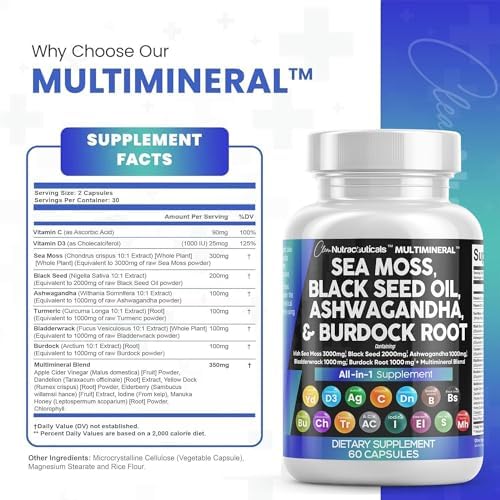 Introducing the MultiMineral Blend – Sea Moss Pills, Black Seed Oil Pills, Ashwagandha Root, Bladderwrack Capsules and Burdock Root Capsules that contain 10+ powerhouse ingredients, turmeric curcumin capsules, Apple Cider Vinegar, Chlorophyll, Manuka Honey, and more! These sea moss bladderwrack burdock root capsules are alternatives to sea moss gummies, black seed oil gummies, and ashwagandha gummies for men. Not usual sea moss raw organic, wildcrafted sea moss gel or ashwagandha supplements.