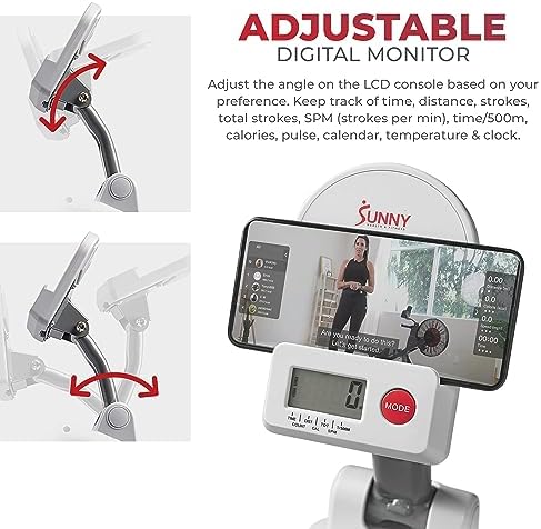 Sunny Health & Fitness Compact Folding Magnetic Rowing Machine with 43 Inch Slide Rail, 285 LB Max Weight, Synergy Power Motion, LCD Digital Monitor, Super Quiet & Smooth, and Ergonomic Foot Pedals